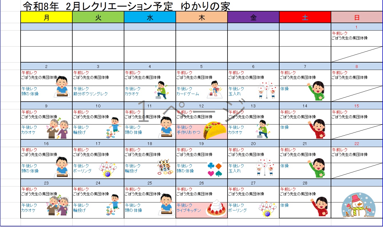 ゆかりの家 レクレーション予定表2月分